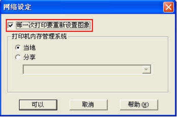 d. 點(diǎn)擊“網(wǎng)絡(luò)設(shè)定”按鈕,勾選“每打印一次要重新設(shè)置圖像”單選框