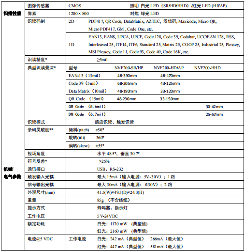 NVF200 系列固定式條碼掃描器的參數(shù)規(guī)格如下: