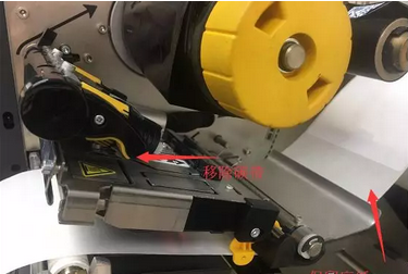 這時(shí)請(qǐng),剝離部分標(biāo)簽,保留20cm左右的底紙,將紙卷回卷,讓底紙穿過(guò)整個(gè)打印支架,同時(shí)卸下碳帶。