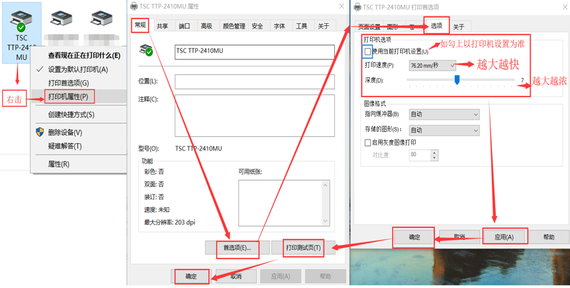 1.9右擊打印機屬性-點常規(guī)選項-選項-進行打印速度及深度設(shè)置
